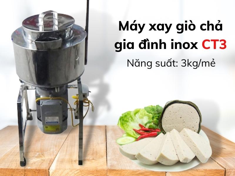 CT3 cũng là một trong model máy xay giò chả gia đìnhcho năng suất 3kg được bán chạy. Dòng máy có thể kế nhỏ gọn, với chất liệu inox chắc chắn chống va đập và han gỉ tốt. Máy có công suất động cơ lên đến 2.2kw với năng suất 3kg.