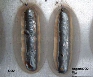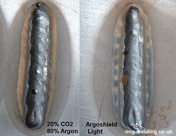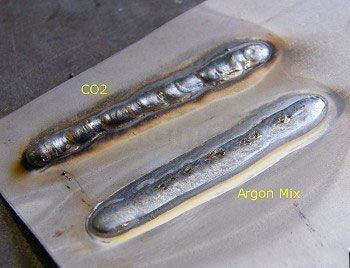 Để chúng ta hiểu rõ hơn về các loại khí sử dụng trong máy hàn mig khi hàn mig chúng ta sẽ so sánh các loại khí thường được sử dụng khi hàn mig gồm có các loại sau :CO2; hỗn hợp khí gồm 80%Argon + 20%CO2; hỗn hợp khí gồm 93%Argon + 5%CO2 + 2%O2; hoặc Argon tinh khiết. Các khí được sử dụng trên cùng một thiết lập của máy hàn đối với thép 1,5mm, các bình khí được sử dụng cùng chung một thiết lập với đồng hồ điều chỉnh khí.