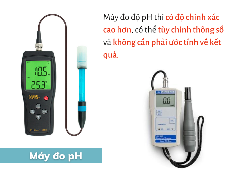 Còn máy đo độ pH thì có độ chính xác cao hơn, có thể tùy chỉnh thông số và không cần phải ước tính về kết quả. Tuy nhiên cũng vì điều này mà dòng máy có mức giá thành đắt hơn so với bút đo pH và đòi hỏi thực hiện theo đúng quy trình. Đây là dụng cụ tiên tiến hơn so với dòng bút đo cầm tay, có độ chính xác cao hơn đặc biệt là trong phòng thí nghiệm, lưu trữ kết quả đo tốt. Hầu hết máy đo pH cầm tay đều có khả năng tự động bù trừ nhiệt độ, tích hợp đầu dò nhiệt độ hoặc đầu dò rời. Độ chính xác cao hơn so với bút đo pH chỉ 0.001 đơn vị pH, sở hữu 2 đặc tính này giúp kết quả đo chính xác cao hơn.