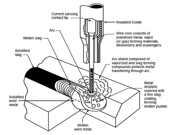 Mô tả hàn dây lõi thuốc: hồ quang được cháy giữa các dây điện cực đươc tiếp điện bằng các ống tiếp điện và các chi tiết sẽ làm cho chảy đồng thời ống dây trong khi hàn, thuốc hàn và mép hàn. Lúc này thì các giọt kim loại đã nóng chảy sẽ được bao phủ bằng một lớp xỉ đã nóng chảy. Khi mà các giọt kim loại nóng chảy chuyển vào vũng chảy, lúc này thì xỉ hàn nổi lên tạo thành lớp che chắn cho mối hàn.Phân tích vai trò của lõi thuốc: