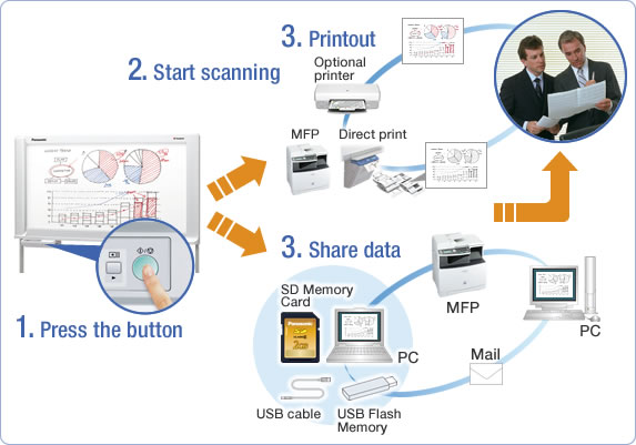 Bảng điện tử được liên kết với máy in cho phép bạn có thể in được các tài liệu trình chiếu hay các ghi chú trên bảng hoặc trực tiếp lưu chúng dưới dạng một file PDF / TIFF vào máy tính hoặc bộ nhớ flash USB thiết bị. Điều này làm cho các buổi thảo luận hiệu quả hơn, loại bỏ thời gian dành cho ghi chú viết tay. Bảng điều khiển được panasonic thiết kế trực quan và rất dễ dàng để sử dụng. Khung kim loại cũng tăng thêm sự chắc chắn, sang trọng phù hợp cho bạn đặt nó trong các hội nghị, phòng họp. Thêm vào đó, bảng điện tử Panasonic được thiết kế để tiêu thụ ít năng lượng, có chế độ tự động tắt khi không sử dụng.
