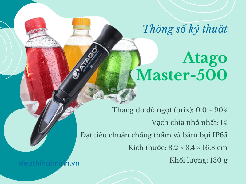 Khúc xạ kế đo độ ngọt Atago Master-500 được thiết kế nhỏ gọn, dạng cầm tay đo dễ dàng. Máy được đánh giá cao và sử dụng phổ biến trong ngành thực phẩm, sản xuất nước ép, nước giải khát, bánh kẹo,... 2. Thông số kỹ thuật: