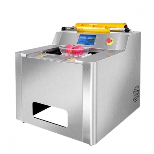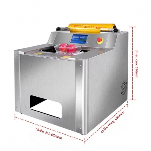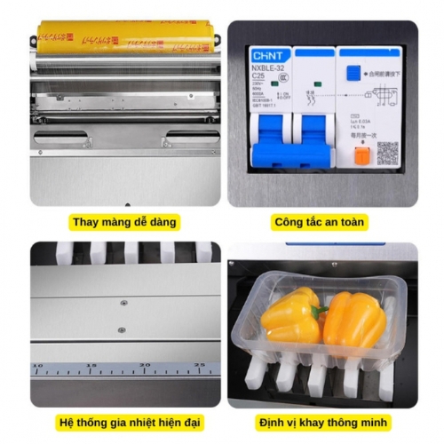 Máy có thể xử lý các sản phẩm với chiều cao lên tới 150mm và trọng lượng tối đa 3kg. Điều này cho phép doanh nghiệp đóng gói nhiều loại thực phẩm khác nhau trên cùng một thiết bị: từ những khay rau củ nhỏ, đến các khay thịt hải sản cỡ lớn. Phạm vi hoạt động rộng (chiều dài 80-280mm, chiều rộng 90-200mm) giúp máy dễ dàng đóng gói hầu hết các kích thước khay xốp tiêu chuẩn trên thị trường.c. Thiết kế gọn gàng, tiết kiệm không gian