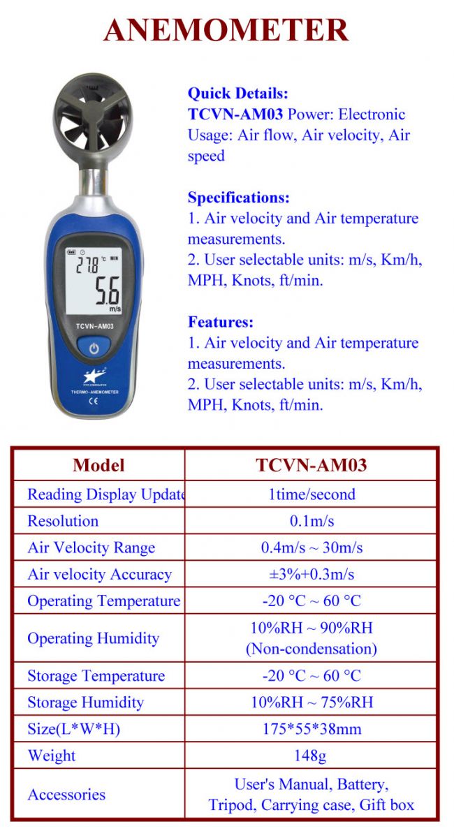 Máy đo tốc độ gió cầm tay TCVN-AM03 được ứng dụng phổ biến trong các ngành công nghiệp điện lạnh, ống thông gió, giám sát môi trường, đo lường chuyển hướng, dự báo thời tiết, lưu thông tin của các mốc thời tiết cho công việc ngoài trời,...Thiết kế kiểu dáng hiện đại, nhỏ gọn tiện lợi. Thao tác dễ dàng, khả năng đo nhanh trả kết quả với độ chính xác cao.
