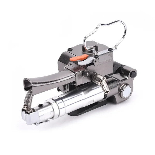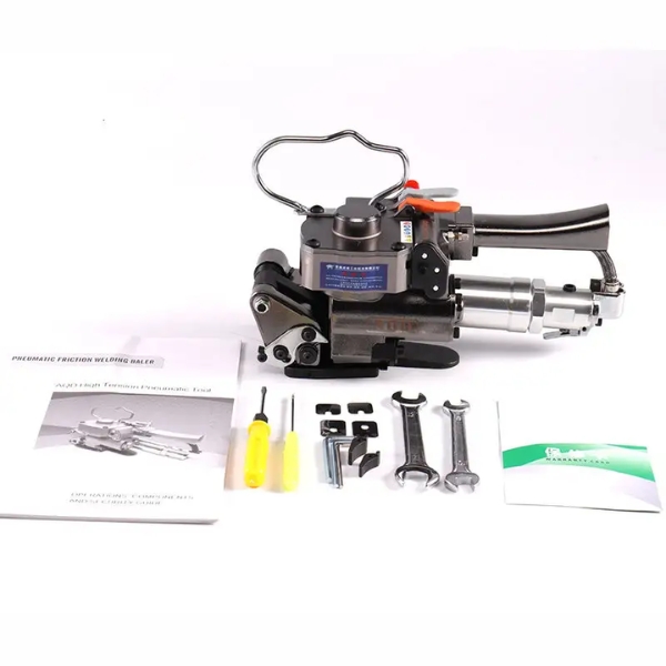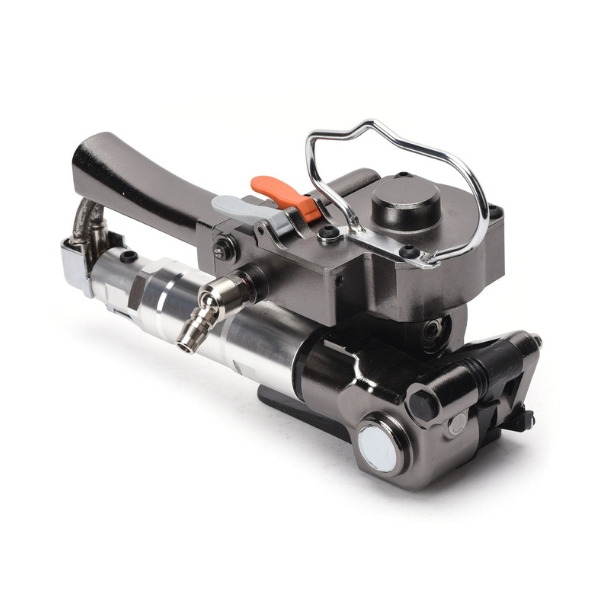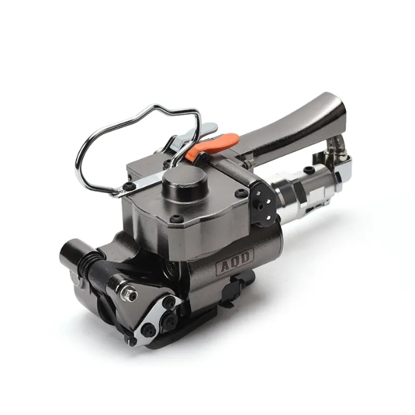 AQD19 là máy đóng đai khí nén cầm tay, sử dụng khí nén kết hợp công nghệ hàn ma sát để siết – hàn – cắt dây đai PET/PP mà không cần bọ sắt. Máy được thiết kế cho đóng đai pallet nặng, kiện hàng công nghiệp, đặc biệt phù hợp các nhà máy có sẵn hệ thống khí nén. Với lực siết tối đa lên tới 4500N, AQD19 nằm ở phân khúc rất mạnh trong dòng máy khí nén, cao hơn A25 (3500N) và tiệm cận máy pin 5000N, nhưng hoạt động ổn định liên tục, không phụ thuộc pin.