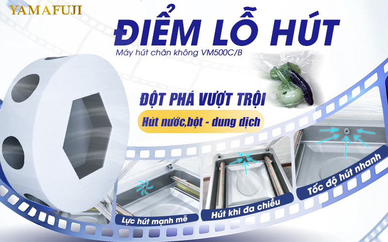 - Bộ phận điểm lỗ hút khí phía bên trong buồng hút của máy hút chân không VM500C/B được thiết kế đặc biệt hơn. Đó chính là điểm nâng cấp vượt bậc hơn hẳn so với các máy trên thị trường, cải tiến này giúp cho động cơ có thể hút được không khí với nhiều chiều hướng khác nhau, diện tích rộng hơn và ngăn chặn lượng bụi, thực phẩm có thể bị hút trực tiếp vào bên trong buồng của động cơ.