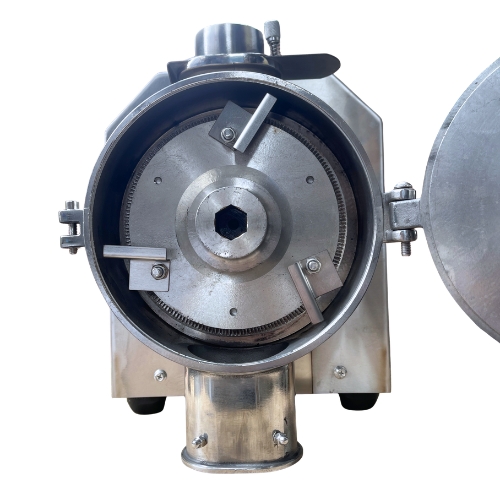 Nguyên lý hoạt động: Sau khi được đưa vào cửa nạp, nguyên liệu trước tiên đi vào buồng nghiền, nơi các mảnh lớn được nghiền nhỏ hơn. Sau đó, nguyên liệu được vận chuyển vào buồng xay bằng trục khuấy của đĩa nghiền thụ động. Động cơ dẫn động đĩa nghiền quay, tạo ra một khe hở nhỏ giữa nó và đĩa nghiền cố định. Nguyên liệu rơi qua lỗ trung tâm và được hút giữa hai đĩa nghiền nhờ lực ly tâm (rang nghiền) và ma sát nén, dần dần được nghiền, cắt và tán nhỏ thành bột, sau đó được thải ra từ mép của các đĩa nghiền.