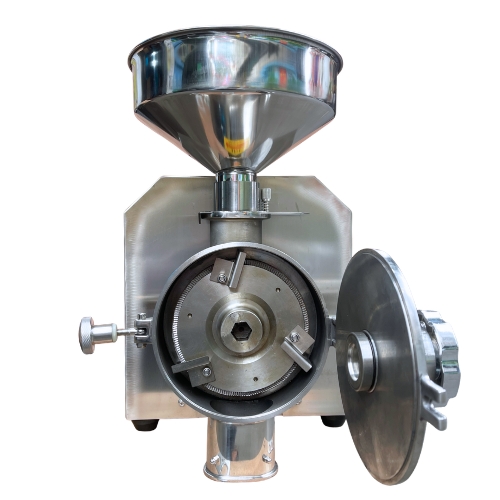 Nguyên lý hoạt động: Sau khi được đưa vào cửa nạp, nguyên liệu trước tiên đi vào buồng nghiền, nơi các mảnh lớn được nghiền nhỏ hơn. Sau đó, nguyên liệu được vận chuyển vào buồng xay bằng trục khuấy của đĩa nghiền thụ động. Động cơ dẫn động đĩa nghiền quay, tạo ra một khe hở nhỏ giữa nó và đĩa nghiền cố định. Nguyên liệu rơi qua lỗ trung tâm và được hút giữa hai đĩa nghiền nhờ lực ly tâm (rang nghiền) và ma sát nén, dần dần được nghiền, cắt và tán nhỏ thành bột, sau đó được thải ra từ mép của các đĩa nghiền.