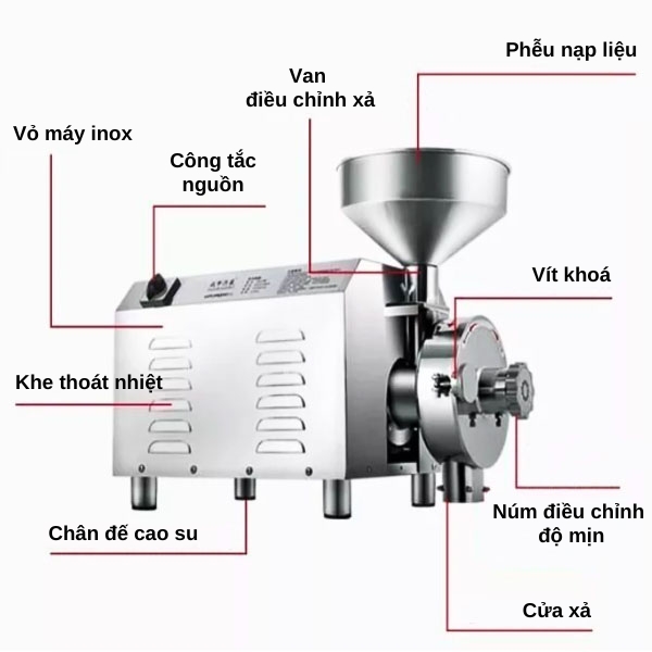 - Cửa xả: Nơi bột đã nghiền được đưa ra ngoài.