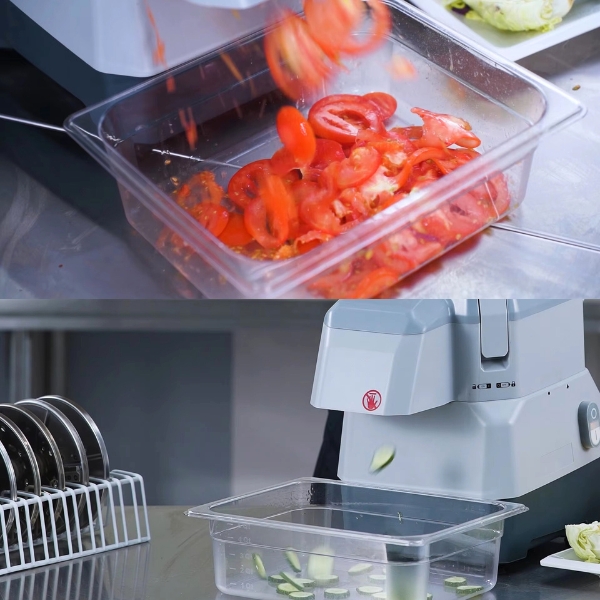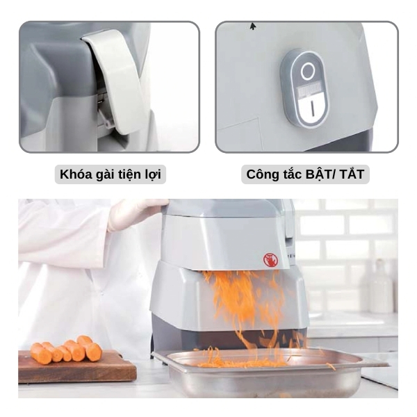 Thao tác sử dụng đơn giản, chỉ cần bật máy và cho rau củ quả vào để tiến hành cắt