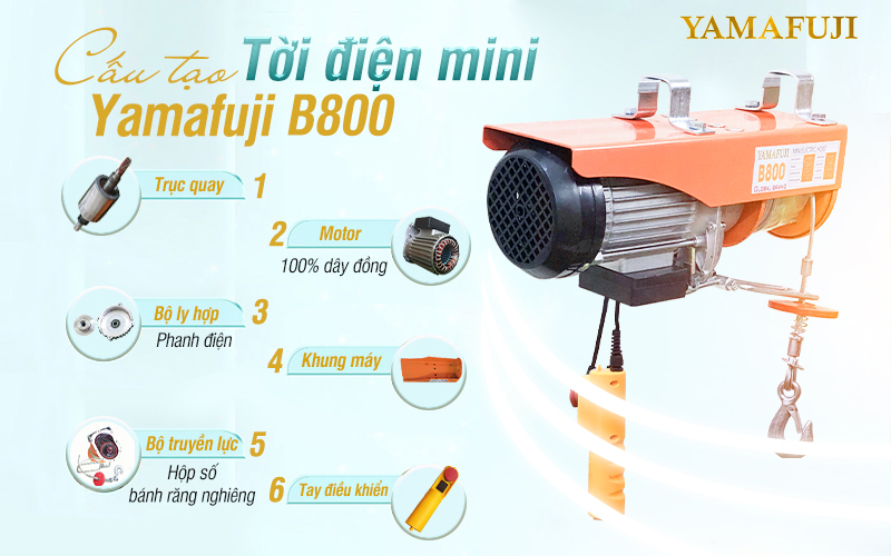 - Máy tời điện mini Yamafuji B800 có khả năng nâng hạ được vật có tải trọng lên tới 800kg, được ứng dụng rộng rãi ở nhiều ngành nghề khác nhau: xây dựng, giao thông vận tải, logistic, hàng không, ...