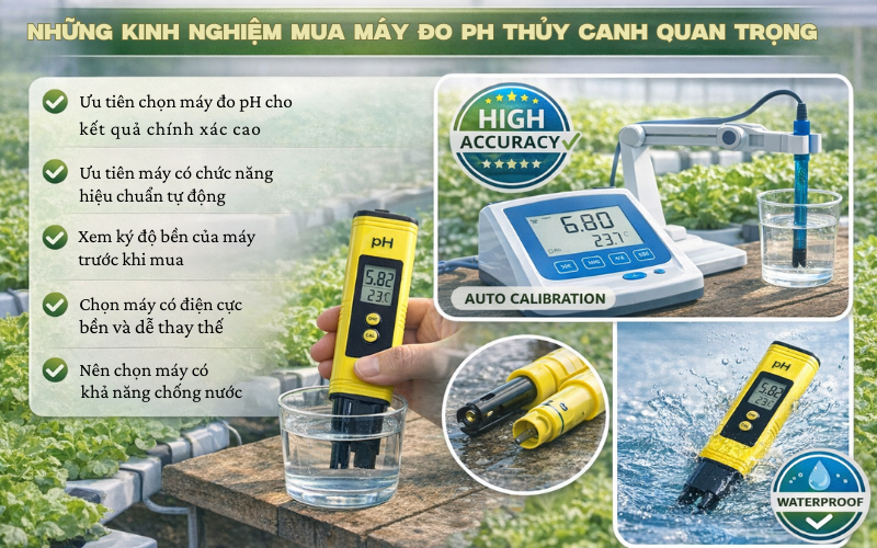 Trên đây là những thông tin và kinh nghiệm mua máy đo pH thủy canh quan trọng mà người trồng rau nên tìm hiểu trước khi lựa chọn thiết bị. Hy vọng bài viết sẽ giúp bạn dễ dàng chọn được máy đo pH phù hợp, hỗ trợ kiểm soát dung dịch dinh dưỡng hiệu quả hơn.