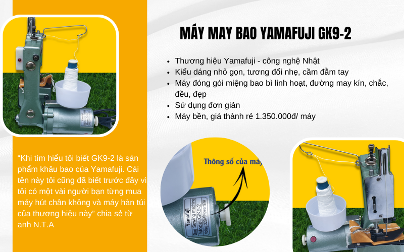 Và đây cũng là một trong số nhiều thương hiệu máy may bao hàng đầu tại Việt Nam do người dùng bình chọn. Bạn có thể tham khảo chi tiết tại bài viết tổng hợp về máy may bao người dùng cần biết. 2. Máy khâu bao Yamafuji GK9-2 giá 1.350.000