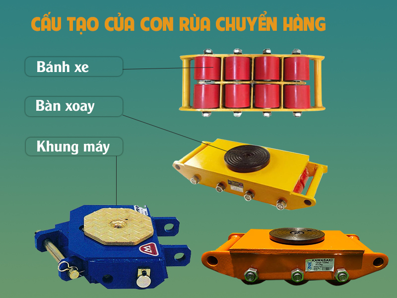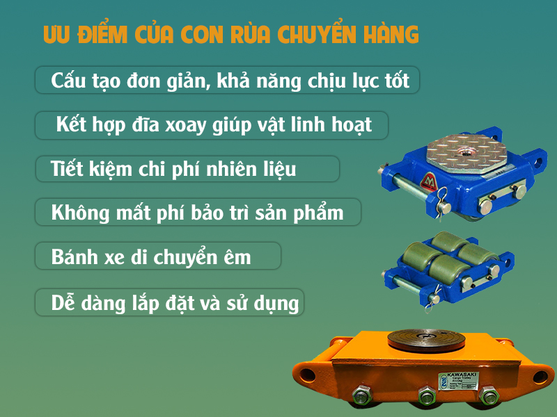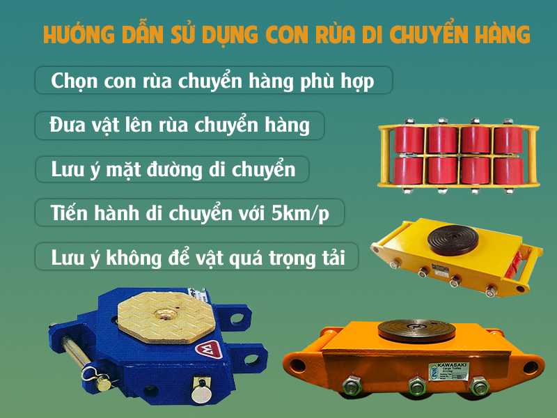 Tùy vào trọng lượng của vật cần di chuyển, bạn tính toán và lựa chọn con rùa chuyển hàng phù hợp. Tiếp đến, bạn dùng đội móc thủy lực để nâng vật và đặt sang con rùa đẩy hàng, rồi dùng thanh đẩy để di chuyển kích rùa.