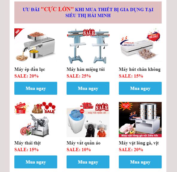 Bạn đang băn khoăn không biết nên mua các thiết bị gia dụng như: máy thái thịt, máy hàn miệng túi, máy hút chân không, máy ép dầu lạc,.. ở đâu chính hãng giá tốt. Một trong  những địa chỉ đáng tin cậy mà quý khách hàng có thể an tâm mua sắm phải kể đến đó là siêu thị Hải Minh. Tất cả những sản phẩm gia dụng mà Hải Minh cung cấp đều có nguồn gốc xuất xứ rõ ràng, đảm bảo chất lượng, giá cả hợp lý đặc biệt khi mua hàng tại Hải Minh trong tháng 11 quý khách sẽ được tham gia chương trình khuyến mại giảm giá cực sốc và rất nhiều phần quà tặng hấp dẫn.