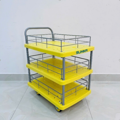 - Xe đẩy hàng SUMIKA T170-T3 sở hữu 3 tầng sàn nhựa PP cao cấp, giúp tăng diện tích chứa hàng gấp ba lần so với các dòng xe thông thường. Khoảng cách giữa các sàn 215mm được tính toán hợp lý, cho phép xếp chồng và phân loại hàng hóa dễ dàng, đặc biệt phù hợp với hàng nhỏ, linh kiện, vật dụng văn phòng hoặc hàng đóng hộp.